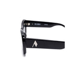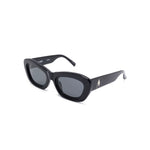 black cat-eye sculpted frame high-shine finish UV-protective grey tinted lenses logo plaque at the arm straight arms with curved tips These glasses come with a protective case. Sunglasses