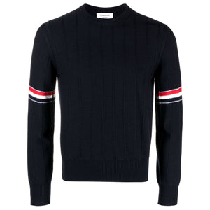 RWB-stripe long-sleeve jumper from THOM BROWNE featuring navy blue, virgin wool, RWB stripe, round neck and long sleeves. Rwb wool crewneck jumper Size and Fit - This piece fits true to size. We recommend you get your regular size. Model is 1,84m / 6ft 1in wearing size 2 (NUM)