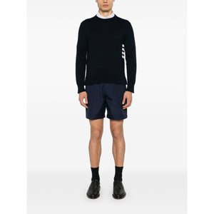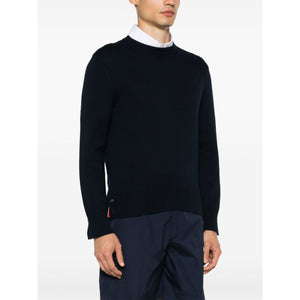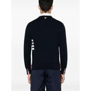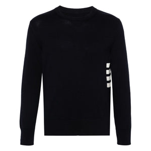 navy blue cotton fine knit ribbed crew neck long sleeves with ribbed buttoned cuffs signature 4-Bar stripe to the side button-fastening side vents signature grosgrain loop tab ribbed hem 4Bar cotton sweater Size and Fit - This piece fits true to size. We recommend you get your regular size. Model is 1,84m / 6ft 1in wearing size 2 (NUM)