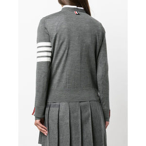 medium grey/white wool fine knit signature 4-Bar stripe signature grosgrain loop tab V-neck long sleeves buttoned cuffs RWB stripe front button fastening two front patch pockets ribbed hem side slits 4Bar wool cardigan