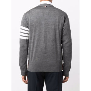 Grey merino 4-Bar knitted cardigan from THOM BROWNE featuring signature 4-Bar stripe, V-neck, front button fastening, long sleeves and buttoned cuffs. 4Bar wool cardigan Size and Fit - This piece fits true to size. We recommend you get your regular size. Model is 1,84m / 6ft 1in wearing size 2 (NUM)