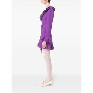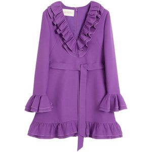 amaranth purple virgin wool-silk blend stretch-design ruffled detailing front tie fastening rear zip fastening V-neck long sleeves flared hem thigh-length Crepe couture short dress Size and Fit - This piece fits true to size. We recommend you get your regular size. Model is 1,75m / 5ft 8in wearing size 40 (IT)