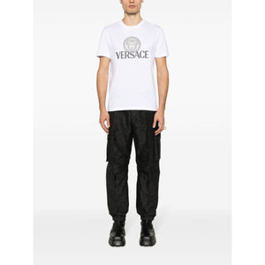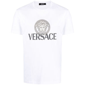optical white cotton jersey texture Medusa Head motif logo print to the front crew neck short sleeves straight hem This item is made from at least 50% organic materials. Learn more about what makes a product Conscious on our Conscious Criteria page. Logo cotton t-shirt Size and Fit - This piece fits true to size. We recommend you get your regular size. Model is 1,84m / 6ft 1in wearing size M