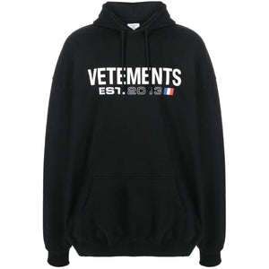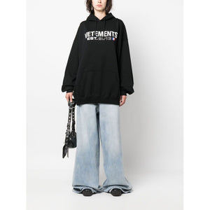 logo-print hoodie from VETEMENTS featuring black/white, cotton blend, logo print to the front, drop shoulder, drawstring hood, front pouch pocket, long sleeves, straight hem and ribbed cuffs and hem. Logo cotton hoodie Size and Fit - This piece fits true to size. We recommend you get your regular size. Model is 1,84m / 6ft 1in wearing size M