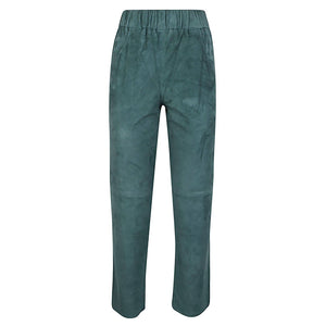 Green trousers, elasticized waist, two pockets behind, two pockets in front. Elastic waist suede trousers Size and Fit - This piece fits true to size. We recommend you get your regular size. Model is 1,75m / 5ft 8in wearing size 40 (IT)