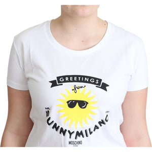Gorgeous brand new with tags, 100% Authentic Moschino basic tees with sunny milano print crafted from pure cotton features a round neck and short sleeves.