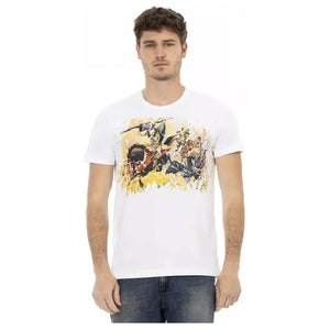 Elevate your wardrobe with the timeless sophistication of Trussardi Action. This crisp White T-shirt, crafted with the finest blend of Cotton and Viscose, merges comfort with luxe style. The bold front print makes an audacious statement, while the round neck and short sleeves keep it classic. Originating from BD, it’s the epitome of contemporary cool.