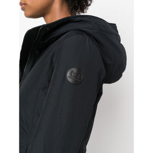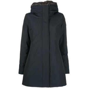 logo-patch zip-up hoodie from WOOLRICH featuring navy blue, cotton blend, padded design, down-feather filling, classic hood, front zip fastening and long sleeves. Boulder parka coat Size and Fit - This piece fits true to size. We recommend you get your regular size. Model is 1,75m / 5ft 8in wearing size S