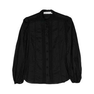 black cotton lace trim band collar front button fastening long puff sleeves elasticated cuffs curved hem Lace trim detail shirt Size and Fit - This piece fits true to size. We recommend you get your regular size. Model is 1,75m / 5ft 8in wearing size 1 (NUM)